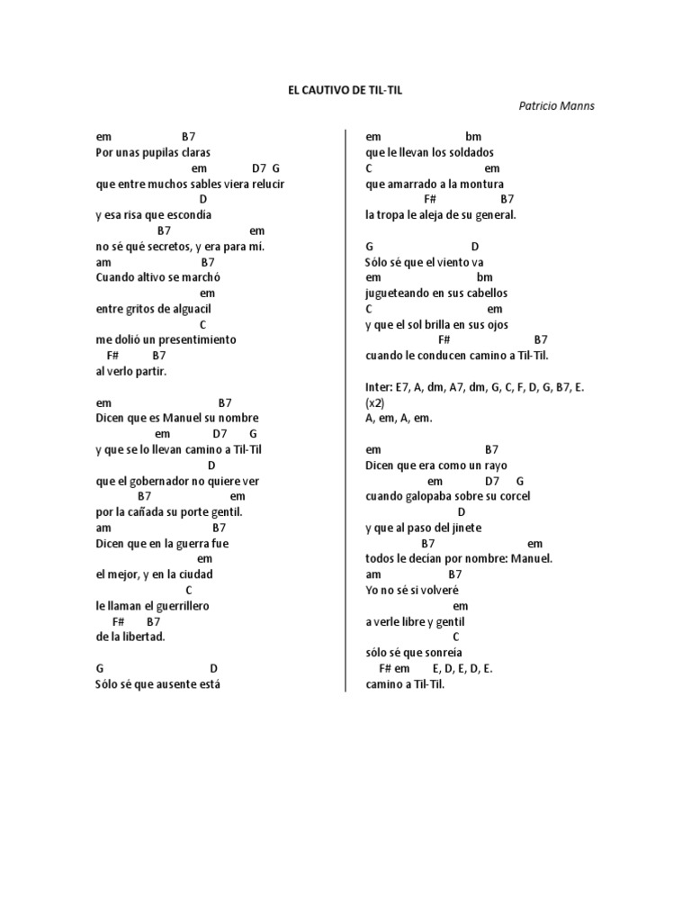 Patricio Mannschile El cautivo de til-til A MIm RE por unas pupilas claras DO que entre muchos sables SOL viera relucir MIm RE y esa risa que escondia DO no se que secretos SI7 y era para mi LAm SI7 Cuando altivo se marchó MIm Entre gritos de algusol DO LAm me nublo un pensamiento SI7 MIm al verlo partir ADicen que es Manuel Rodriguez y que se lo llevan camino a til-til que el gobernador no. Bambuco de Macondo acordes. G Fm Sólo sé que el viento va G Fm jugueteando en sus cabellos C EmB y que el sol brilla en sus ojos D B7 cuando le conducen camino a Til-Til.