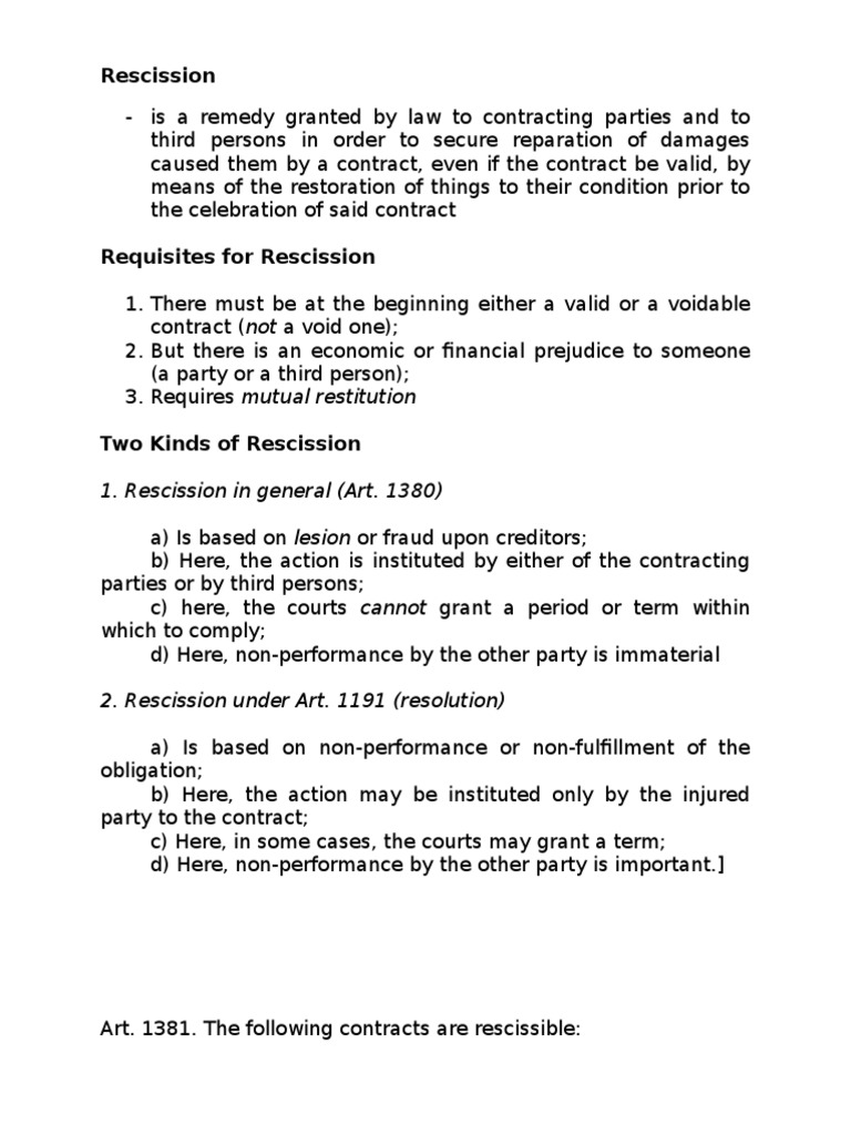 Rescission renders the contract void ab initio and courts will only grant rescission under common law if the parties can be restored to their original positions prior to. The orderer shall have the right to rescission of the contract if performance of part of the delivery is impossible in volume in case of an order of equal objects and he has a founded interest in rejecting a partial delivery. Rescission is the unwinding of a transaction.