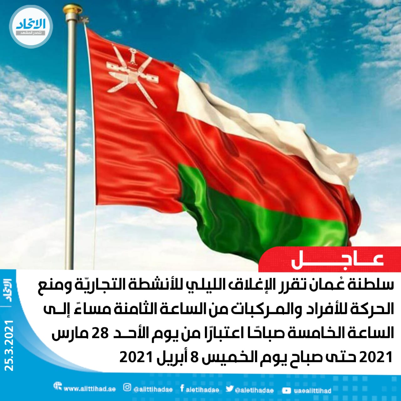 صحيفة الاتحاد On Twitter عاجل سلطنة ع مان تقرر الإغلاق الليلي للأنشطة التجاري ة ومنع الحركة للأفراد والمركبات من الساعة الثامنة مساء إلى الساعة الخامسة صباحا اعتبارا من يوم الأحد 28 مارس 2021 حتى