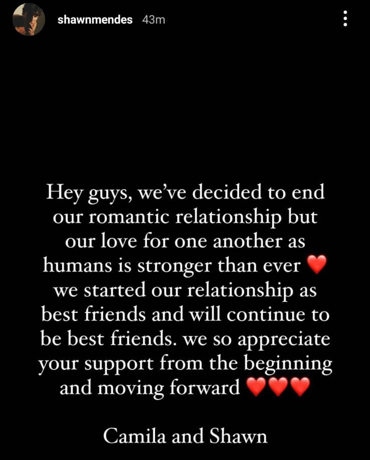 Dalam unggahan tersebut Camila Cabello mengungkapkan hubungannya dengan Shawn Mendes telah selesai. Shawn Mendes dan Camila Cabello kini sudah putus credit. Bukan tanpa sebab publik selalu melihat romansa di antara keduanya yang membuat mereka iri.